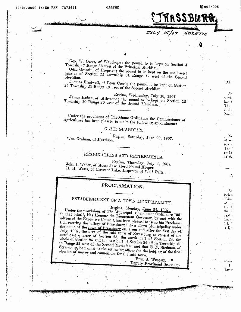 In 1905, the rail line was laid as far as Strasbourg which caused the town to grow rapidly over the next two years. The town was incorporated in 1907.